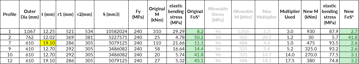 - Delivered an Excel results summary comparing original and amplified moments, factors of safety, and allowable stresses across all profiles and corrosion scenarios.